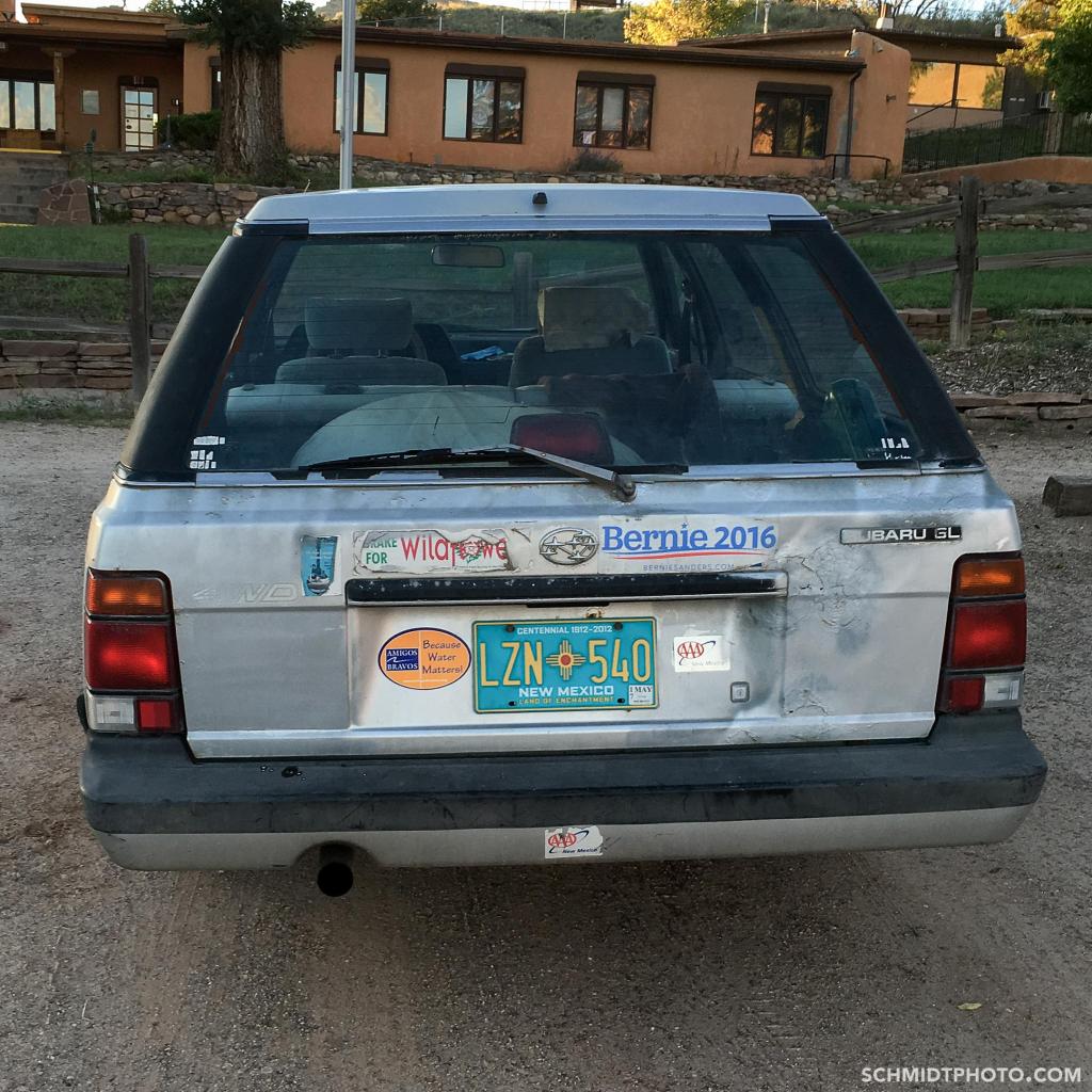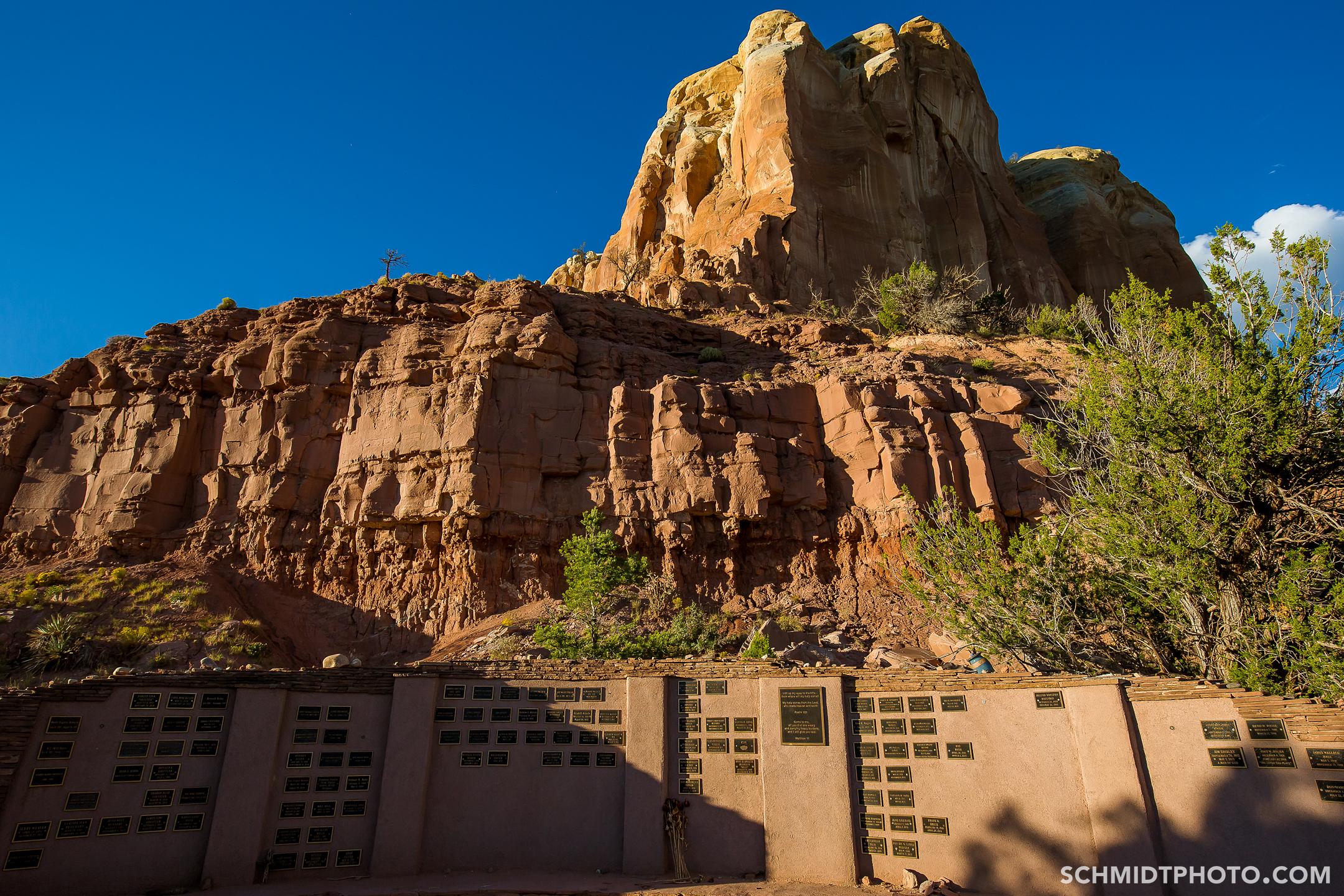 With an hour left to sunset, we picked a shorter hike, which led us by some abandoned shacks before ending at a wall of plaques that stood in front of a butte that rose majestically. The memorial was dedicated to people who loved Ghost Ranch and who had passed. Animals were welcomed too, as evidenced by a cracked urn with a paw print that sat on top of the wall, long emptied of its contents. Eerie silence enveloped us.